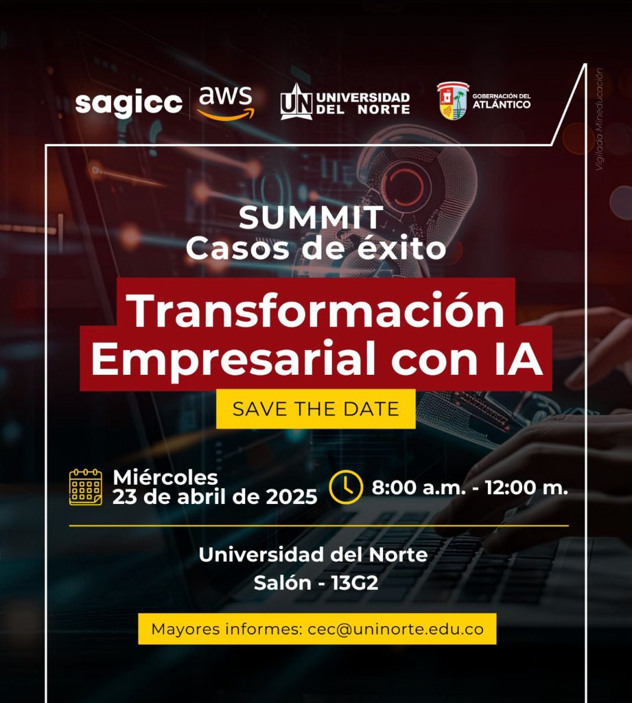 Este miércoles 23 de Abril, estuvimos en la Universidad del Norte, en un evento llamado Transformación Empresarial con IA, un espacio para descubrir cómo la Inteligencia Artificial está impulsando la innovación empresarial en Colombia. Con el apoyo de Amazon Web Services (AWS).